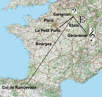 Ainsi on a 3 villes alignées associées aux 3 clés musicales, ce qui justifie la portée musicale sur le visuel.