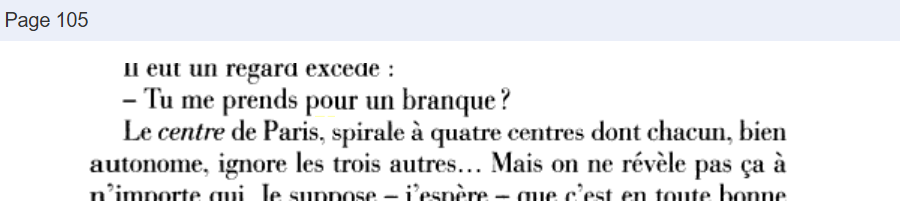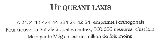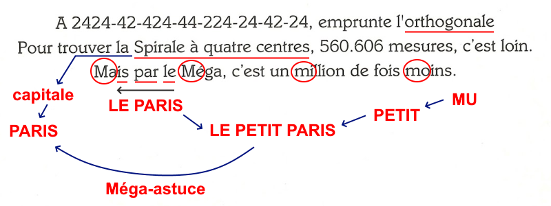 D'autre part la rime cassée dans le texte peut être restaurée en remplaçant Spirale à quatre centres par capitale qui rime avec orthogonale, on retrouve ainsi la méga-astuce directement dans le texte :